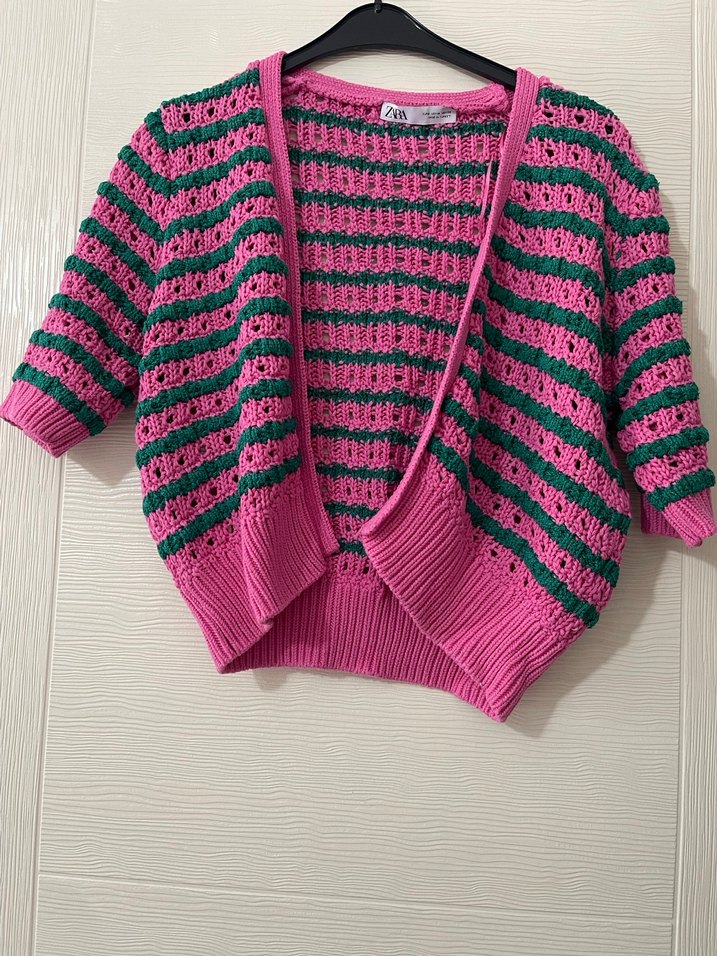 Rahat kesim,Pastel pembe ve yeşil çizgili örgü, bohem tarzdadır
