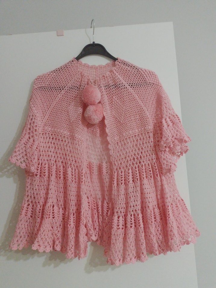 Pembe örgü #lizöz #bolero salaş kesim, bisiklet yaka ve kolsuz tasarıma sahip, yumuşak pastel tonlarda bohem tarzını yansıtıyor. sadece 1 kac kez kullanildi