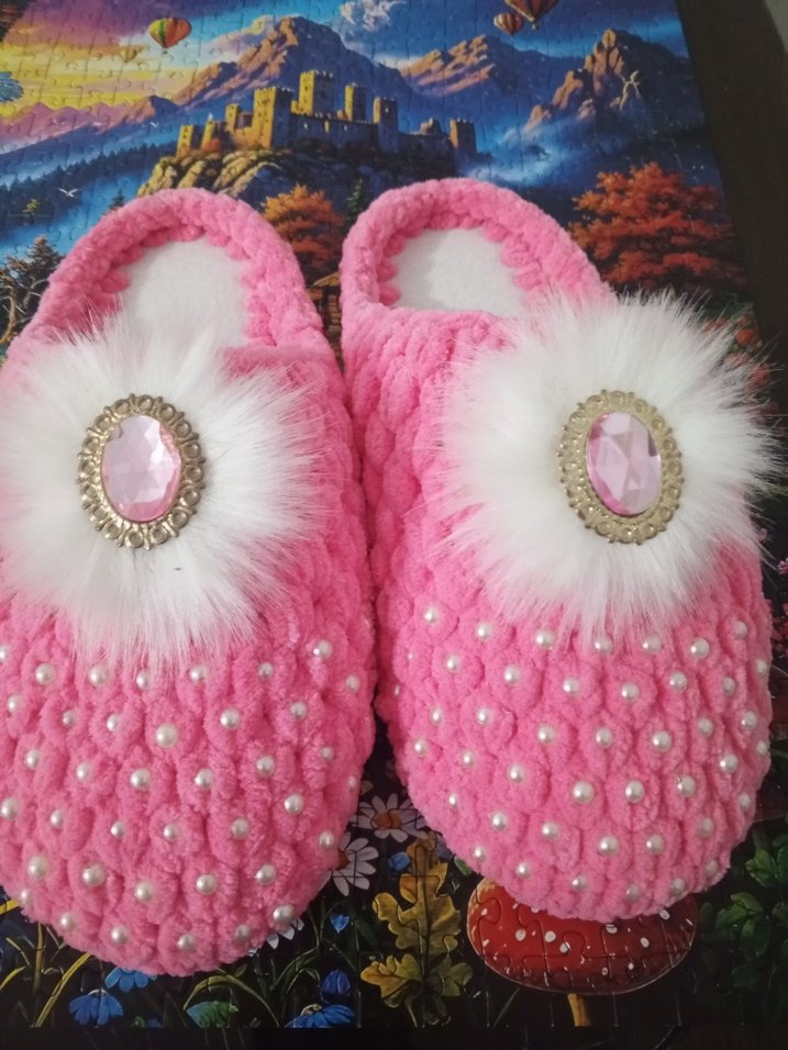 Pembe örgü kumaştan yapılmış, üzeri boncuk işlemeli ve beyaz tüy detaylı, bohem tarzda kadın terlik.