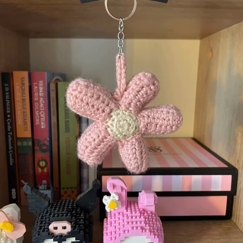 Pastel pembe örgü çiçek anahtarlık, rahat ve bohem tarzda. Anahtarlarınıza yumuşak, retro bir dokunuş katıyor.