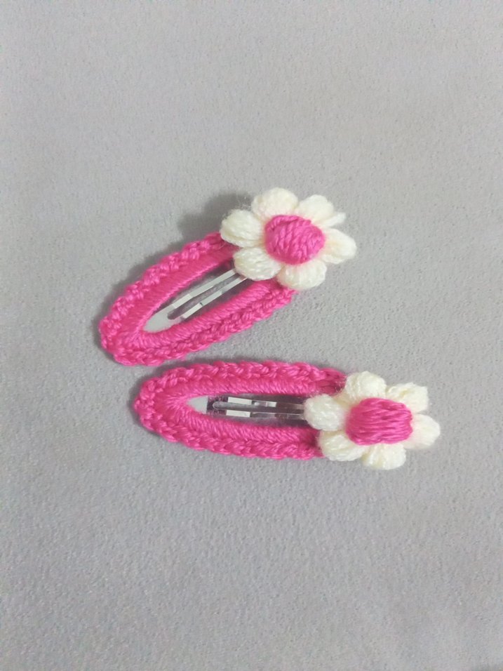 Pembe örgü tokalar, beyaz ve pembe işlemeli çiçek detayları ile çocuklar için tasarlanmıştır. Renkli ve eğlenceli saç aksesuarlarıdır.