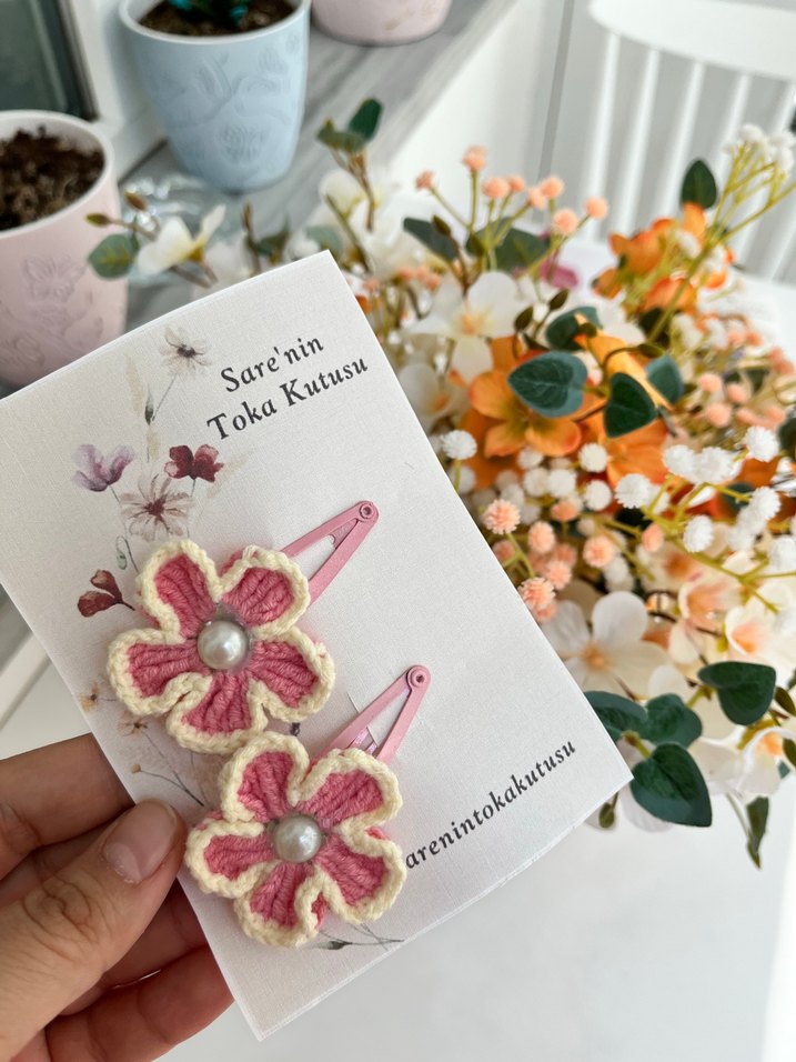 Pembe pastel tonlarında, örgü çiçekli ve inci detaylı çocuk tokaları, bohem tarz için uygun
