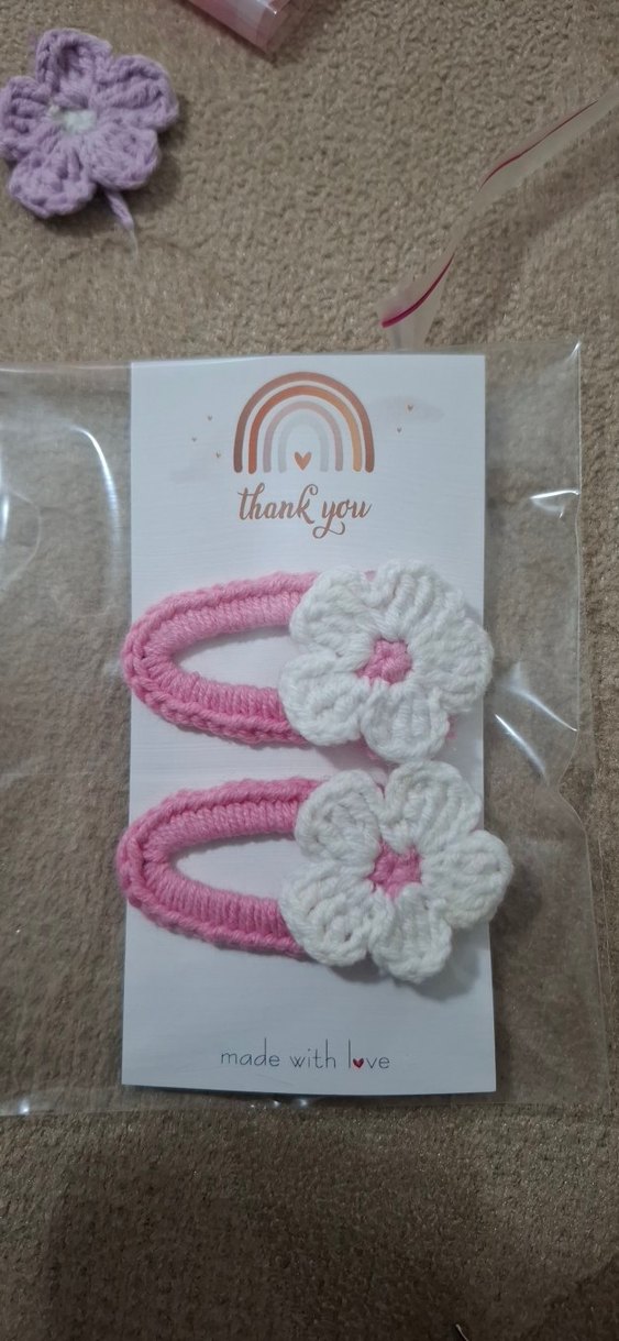 Pembe örgü yapıda, beyaz çiçek desenli, bohem tarzda çocuk tokası seti. 6 cm bütüklüğünde çoklu alımlarda fiyat düşürülebilir.