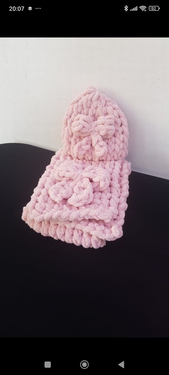 Pastel pembe renkli, kalın örgü dokusuna sahip yumuşak ve rahat çocuk battaniyesi. Çocukları sıcak tutmak için uygundur.