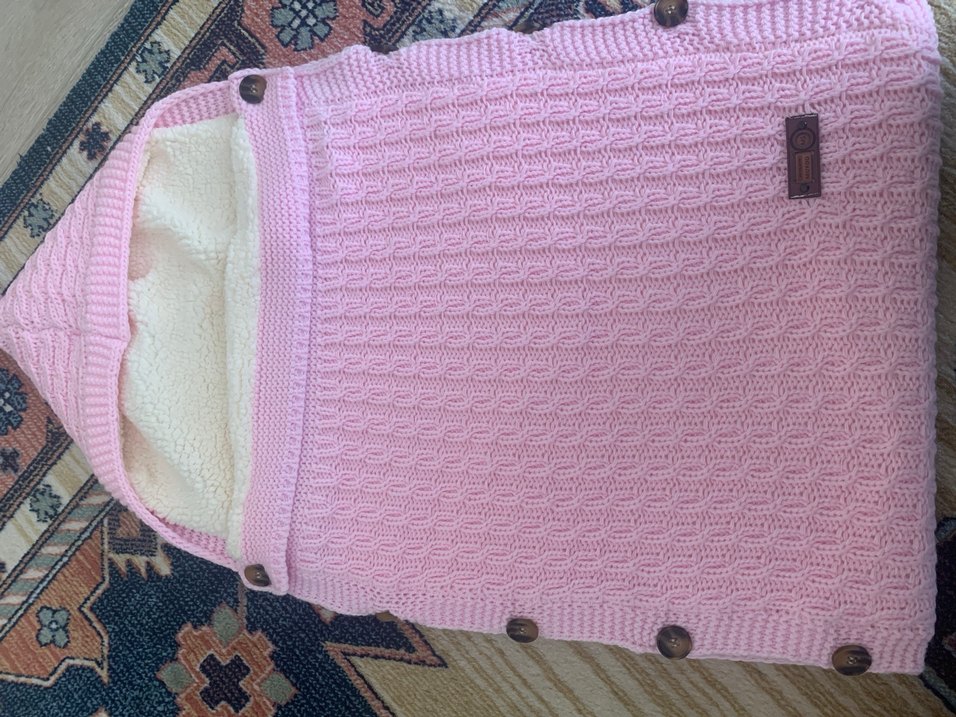 Pastel pembe renkte, düğmeli yumuşak örgü çocuk battaniyesi. Hiç kullanılmadı paketiyle gonderılecek
