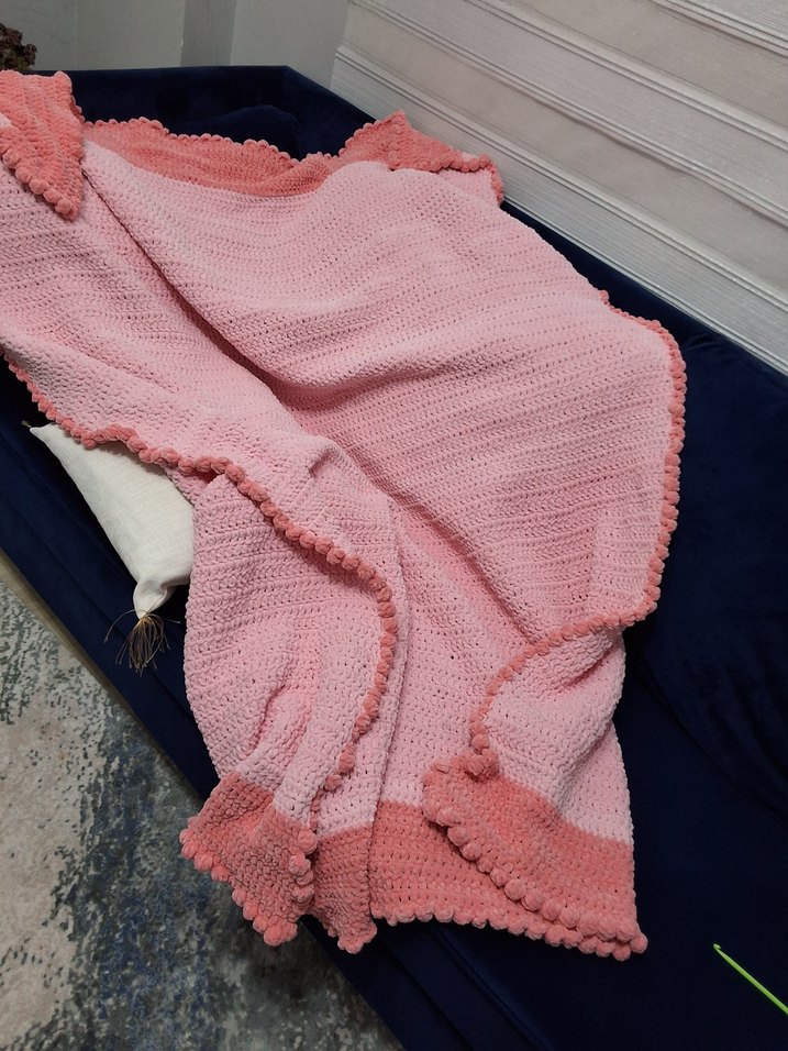 Pastel pembe renkte, süslü kenar detaylı yumuşak örgü çocuk battaniyesi.