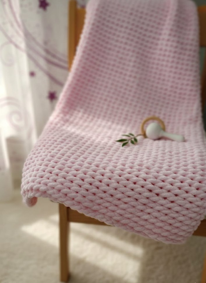 Yumuşak örgüden yapılmış, desensiz pastel pembe çocuk battaniyesi.