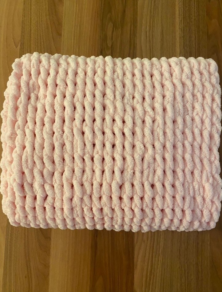 Pastel pembe renkte, yumuşak ve rahat dokulu örgü çocuk battaniyesi, sıcaklık ve konfor sağlar.