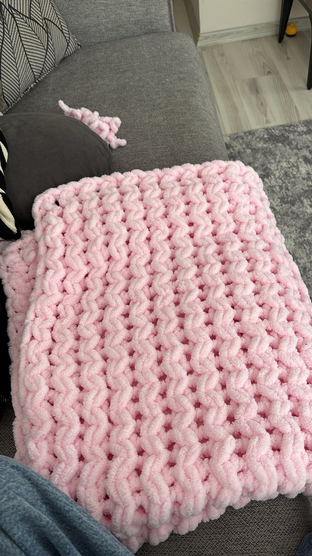 Pastel pembe renkli, yumuşak ve kalın örgü dokusuna sahip çocuk battaniyesi.