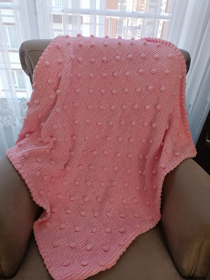 Yumuşak dokulu, ponpon desenli pembe örgü çocuk battaniyesi, sıcaklık ve rahatlık sağlar.
