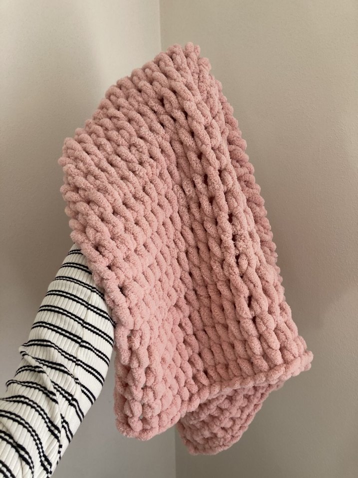 Pastel pembe renkte, yumuşak örgü dokulu ve desensiz çocuk battaniyesi.