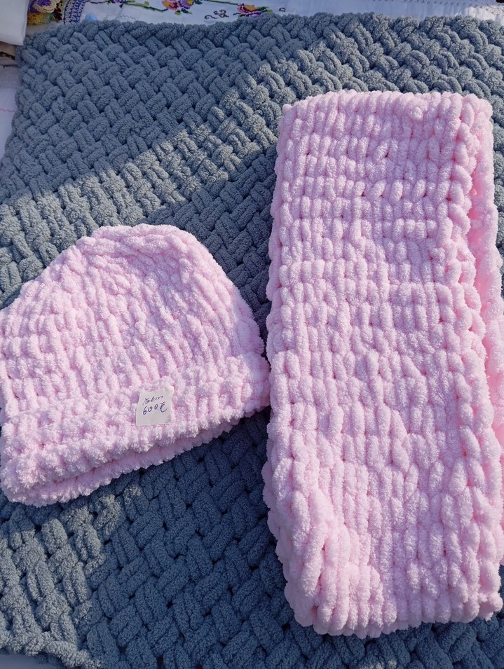 Yumuşak pembe örgü çocuk battaniyesi ve uyumlu bere, dokulu desene 3 parça