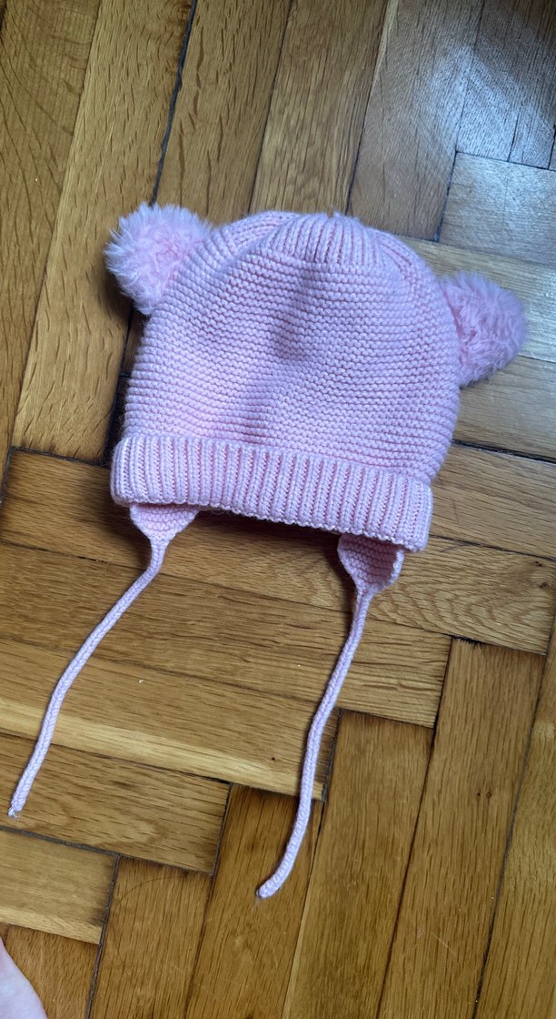 Bu pastel pembe örgü çocuk bere, kulaklıklı ve iki ponponlu olup sıcak tutar ve sade bir sokak stili sunar.