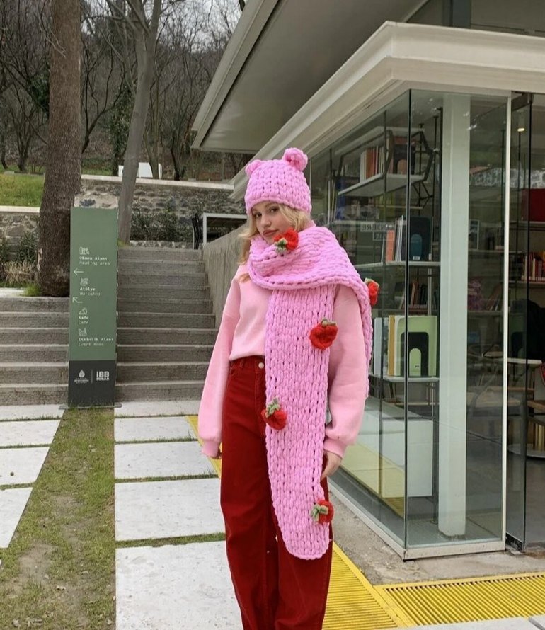 Pastel pembe örgü çocuk bere ve atkı seti, yumuşak dokulu ve sokak modasına uygun, küçük çilek detaylarıyla süslenmiştir.
