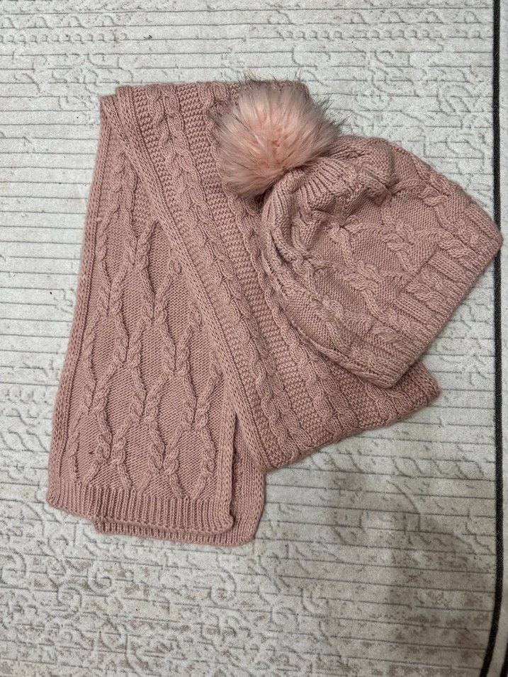 Pembe örgü bere ve atkı seti, bere üzerinde ponpon detayına sahip, çocuklar için sıcak tutar.