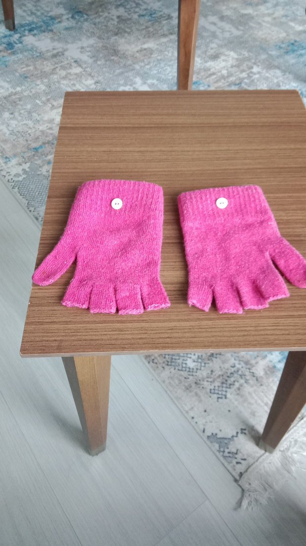 Yumuşak ve sıcak kumaştan örülmüş pembe parmakları açık eldiven, düğme detayıyla rahat kullanım sağlar.