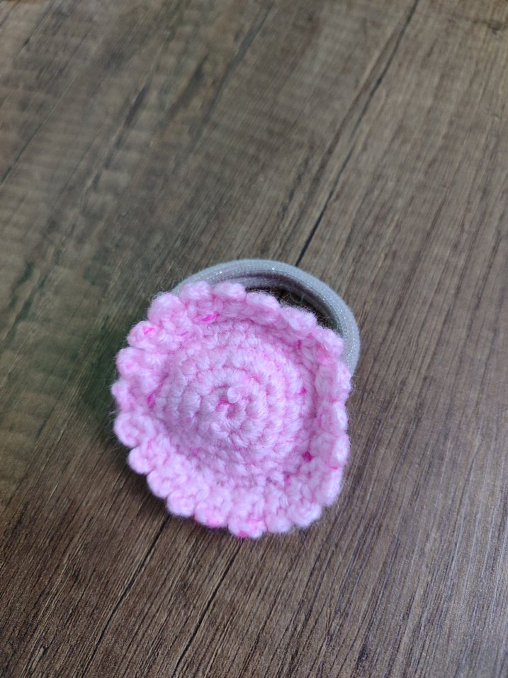 Pastel pembe örgü çiçek detaylı çocuk saç lastiği, sade ve desen içermeyen tasarıma sahiptir.