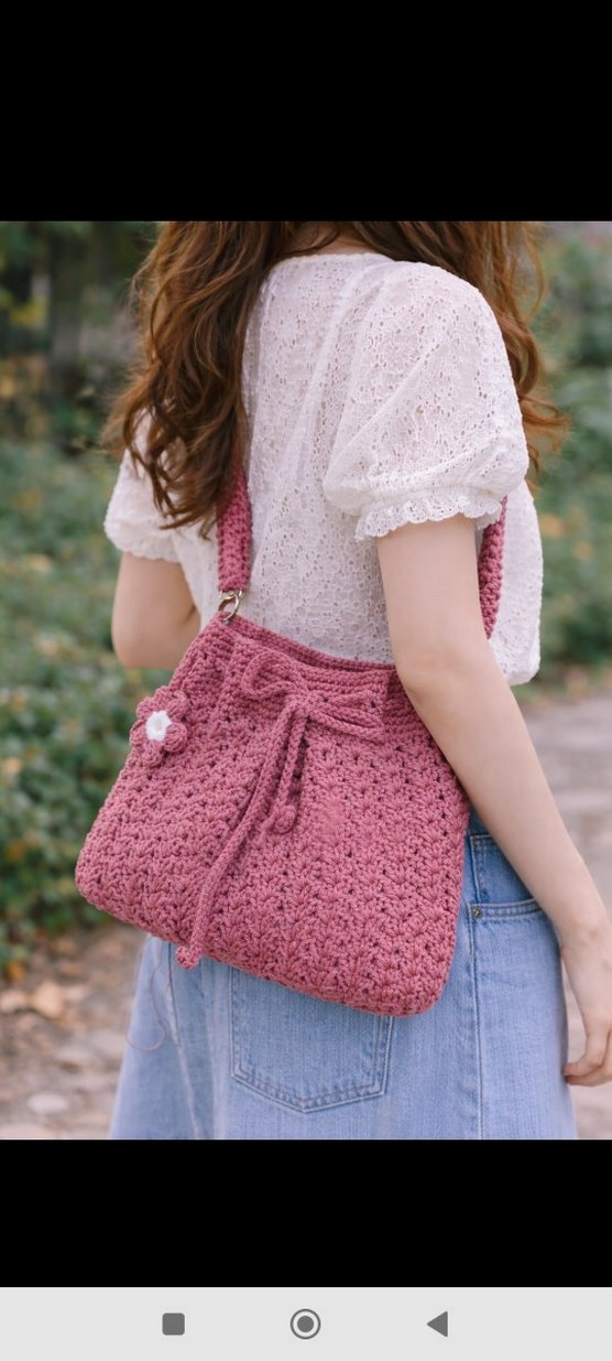 Pembe renkli, dantel detaylı örgü kumaştan yapılmış bohem tarzda, bağcıklı ve günlük kullanıma uygun rahat çanta.