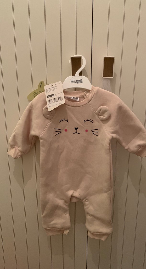 Pembe pastel renkte, örgü detaylı ve sevimli yüz baskılı bebek kız tulumu. Göğsünde küçük kulak detayları bulunur.