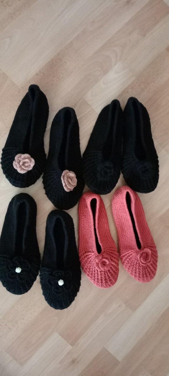 Örgü yapıda, dolgu topuklu kadın ev terlikleri. Koyu pembe ve siyah renklerde, sade çiçek detaylı, günlük kullanıma uygun rahat tasarım.