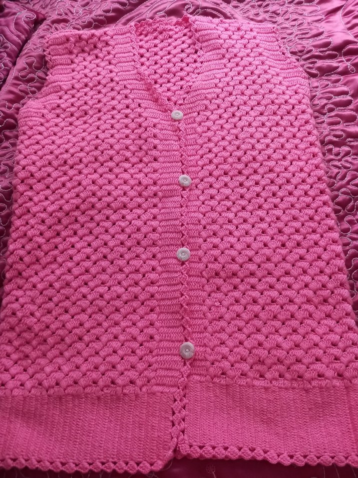 V yaka, düğmeli, uzun pembe örgü süveter. Salaş kesimi ve rahat bohem tarzıyla günlük kullanıma uygun.