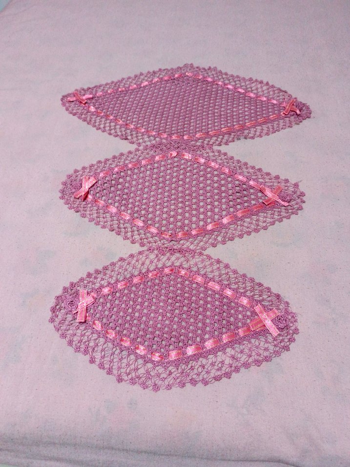 Üç parçalı, kurdele detaylı pembe el yapımı örgü masa örtüsü seti, masanıza geleneksel bir dokunuş katar.
