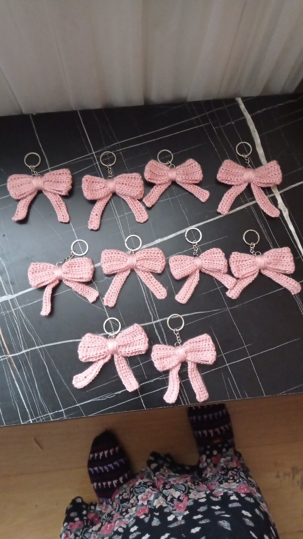 Yumuşak ve sade tasarımlı, pembe örgü fiyonk şeklinde anahtarlık.