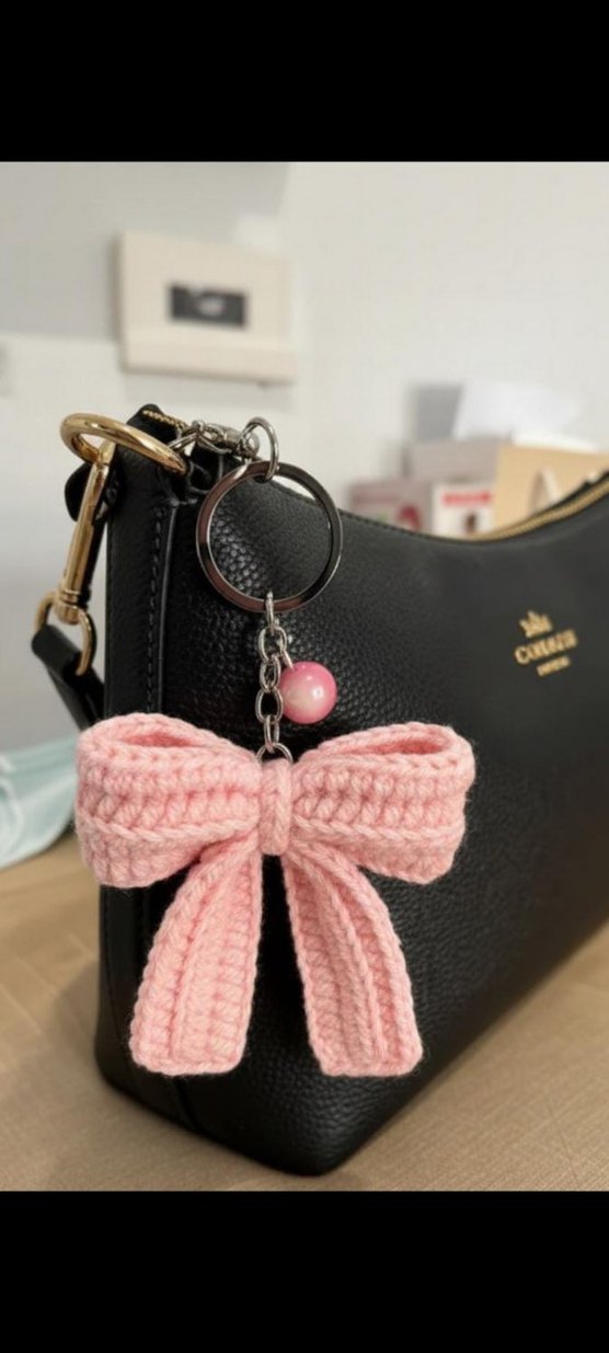 Pastel pembe örgü fiyonk ve boncuklu anahtarlık, rahat ve trend sokak stiline uygun bir dokunuş sağlar. sipariş üzerine hazırlanır, 24 saatte kargoya verilir.