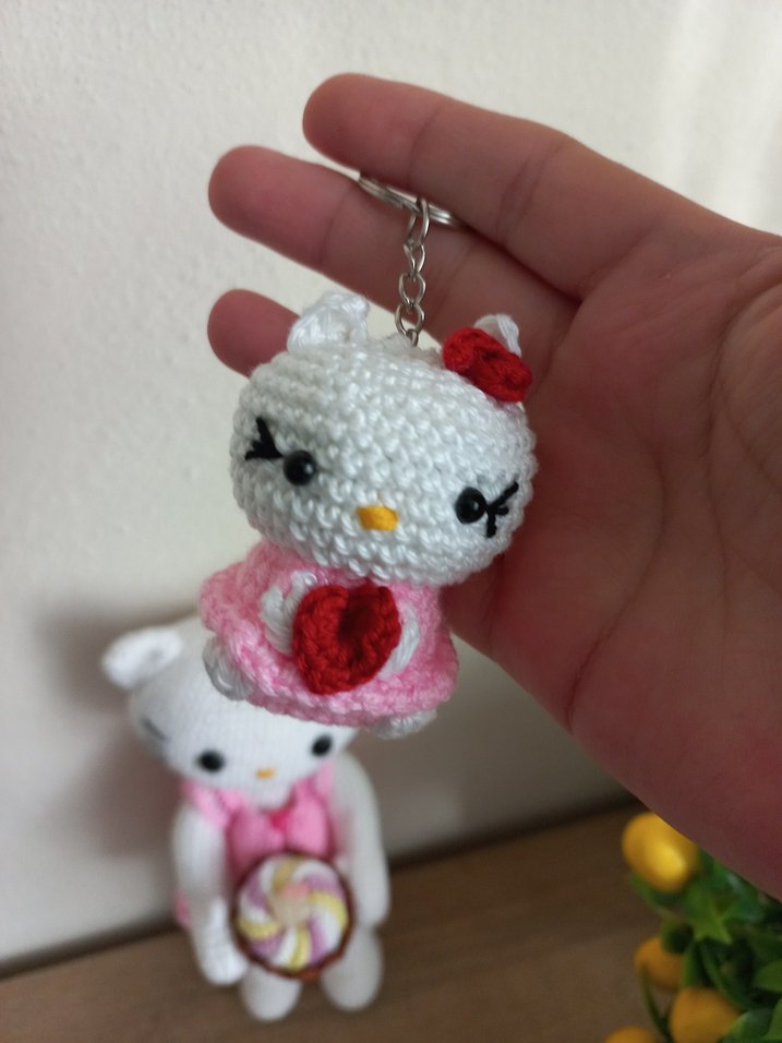 Pembe ve kırmızı kalp detaylı, örgü Hello Kitty figürlü renkli anahtarlık. Rahat ve bohem tarzda tasarlanmıştır.