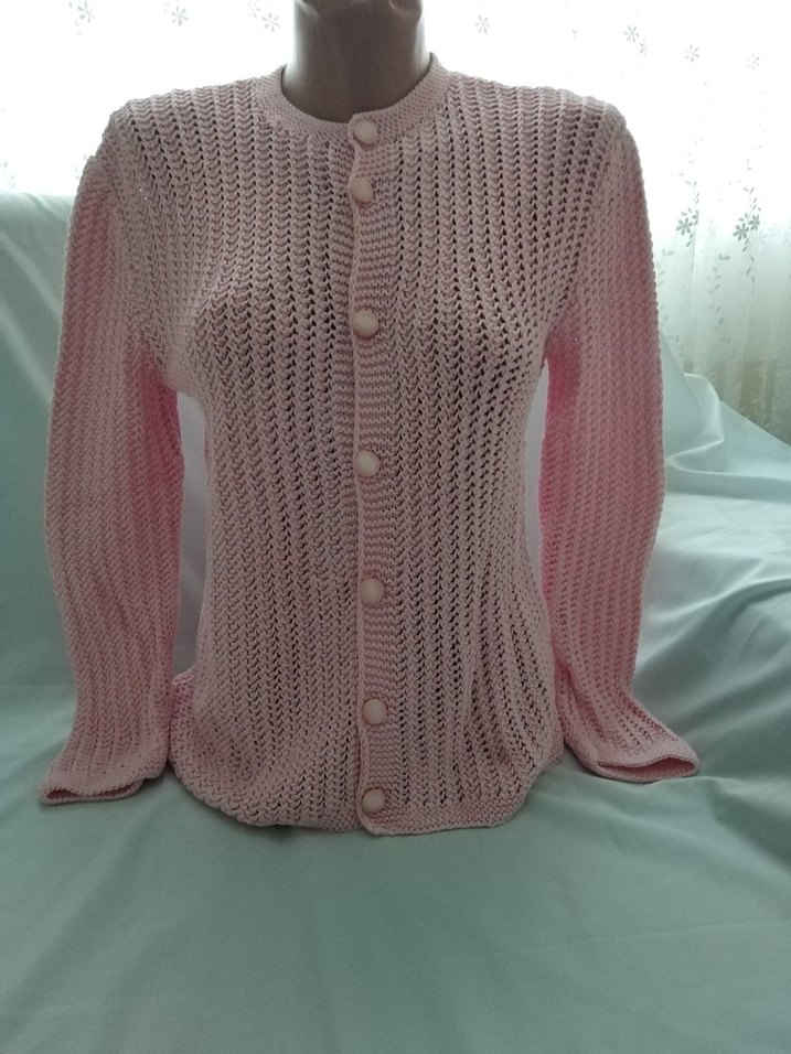 Pembe renkli, uzun kollu ve düğmeli örgü merserize hırka. Rahat kesimi ve sade deseniyle günlük kullanıma uygundur.