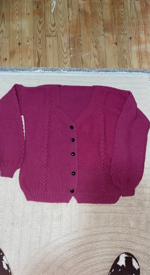 Pembe renkli, uzun kollu ve bol kesim örgü kız hırka. V yaka ve düğmeli kapama özelliğine sahiptir. Annem ördü ama artık giymiyorum.
