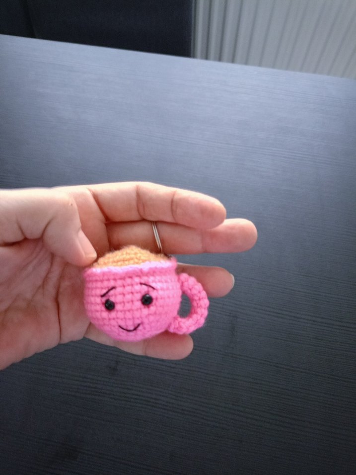 Pembe örgü kadın anahtarlık, pastel tonlarda, gülen fincan şeklinde, sade ve temel stile uygun. ☕