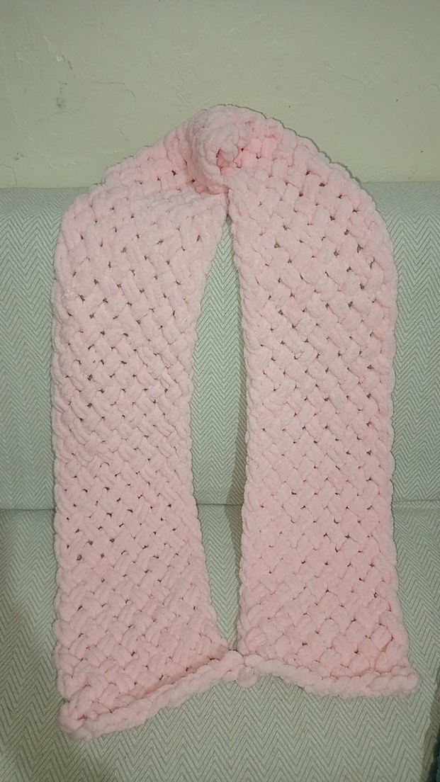 Pastel pembe renkli, yumuşak örgü kumaştan örülmüş, sade ve temel tarzda kadın atkı