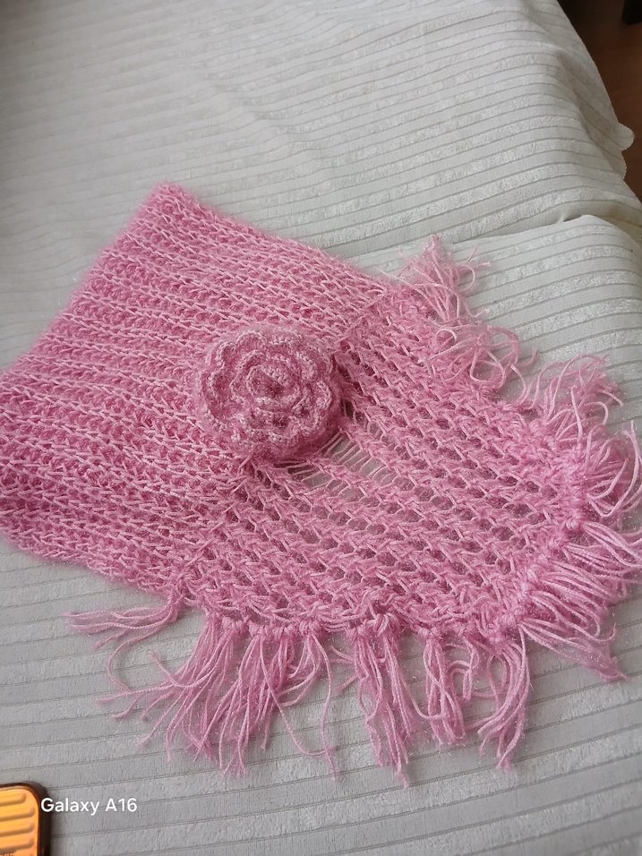 Pembe pastel tonlarında, püsküllü kenarları ve çiçek detayı olan örgü kadın atkısı. Bohem ve retro tarzda, sıcak tutar.