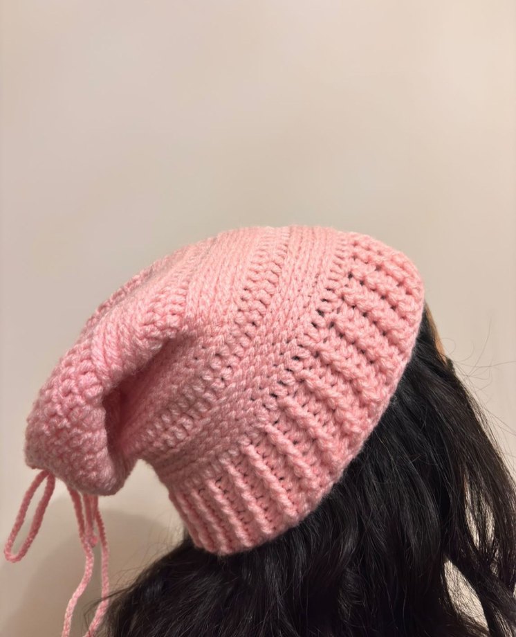 Yumuşak iplikle örülmüş pastel pembe kadın bere, bohem ve retro tarzlar için rahat ve şık bir seçimdir.