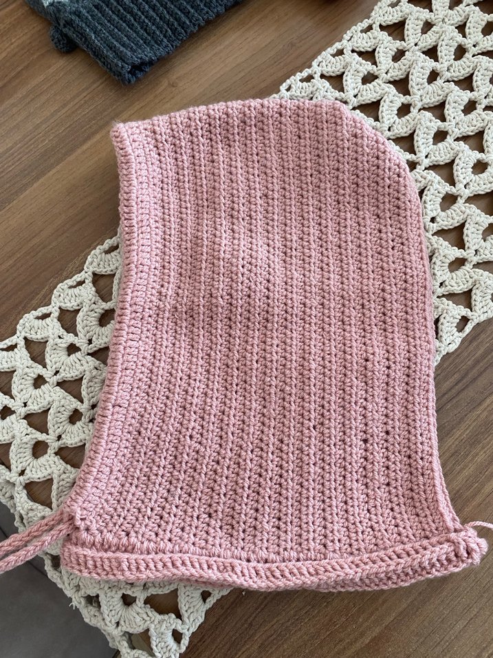 Pastel pembe renkte, örgü bere. Bohem tarzda, yumuşak dokulu ve bağcık detaylı, desensiz tasarım.