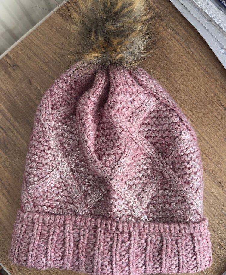 Pembe renkli, örgü dokulu, bohem tarzda, yumuşak ve sıcak hissettiren kadın bere. Üstünde suni kürk ponpon bulunur. ❄️