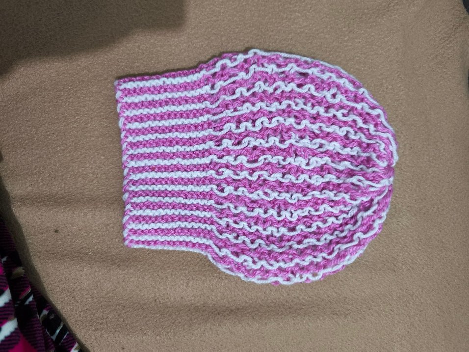 Renkli pembe çizgili, örgü kumaştan yapılmış kadın bere, rahat ve sade bir tarz sunar.