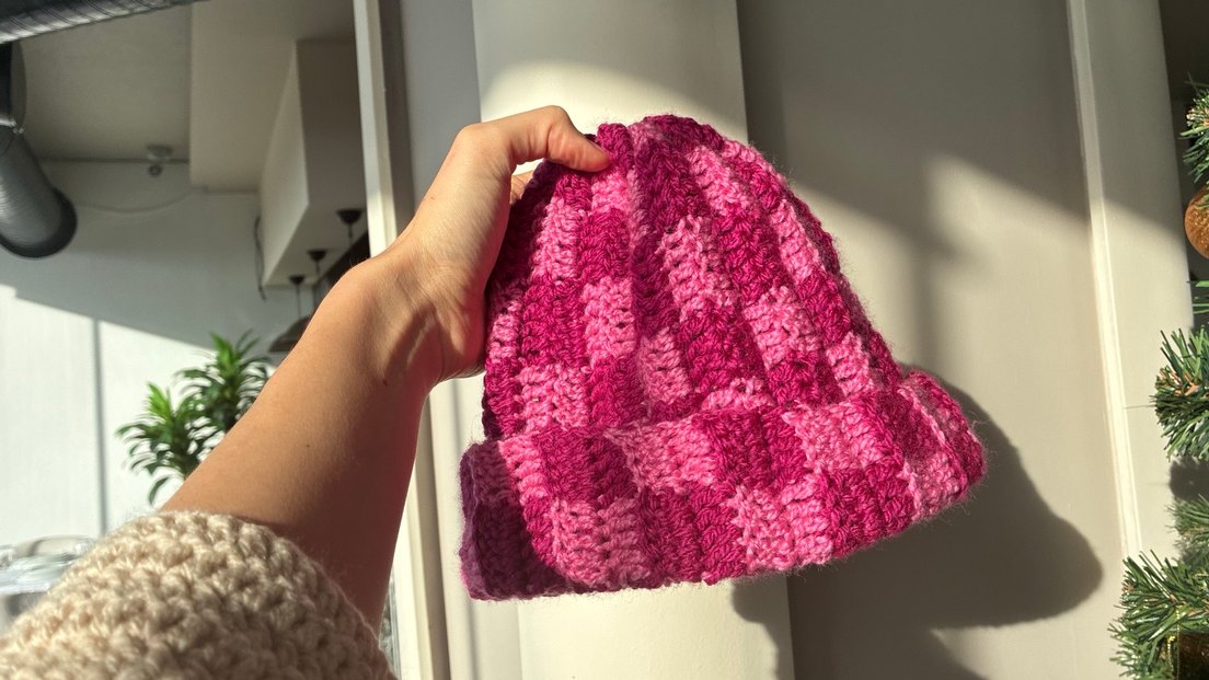 Pembe renkli, örgü kadın bere, rahat ve renkli çizgili desene sahip, sade ve temel bir tarz için uygundur.
