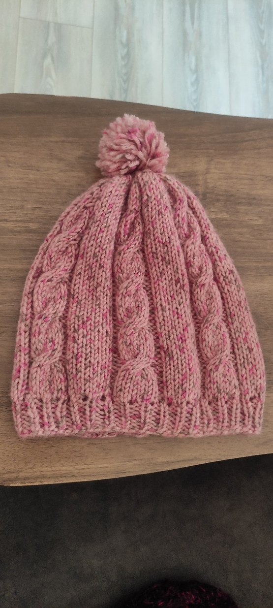 Pembe örgü kadın bere, örgülü desen ve üstte ponpon ile bohem pastel tarzda rahat bir görünüm sunar.