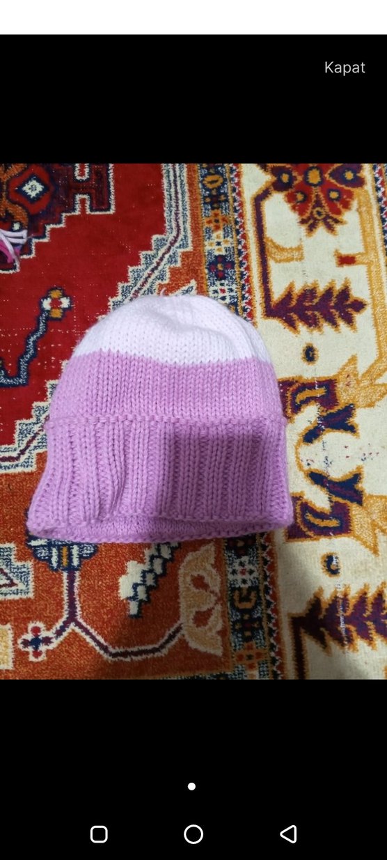 Pastel pembe ve beyaz renkte, yumuşak örgü kumaştan yapılmış, örgü kadın bere.