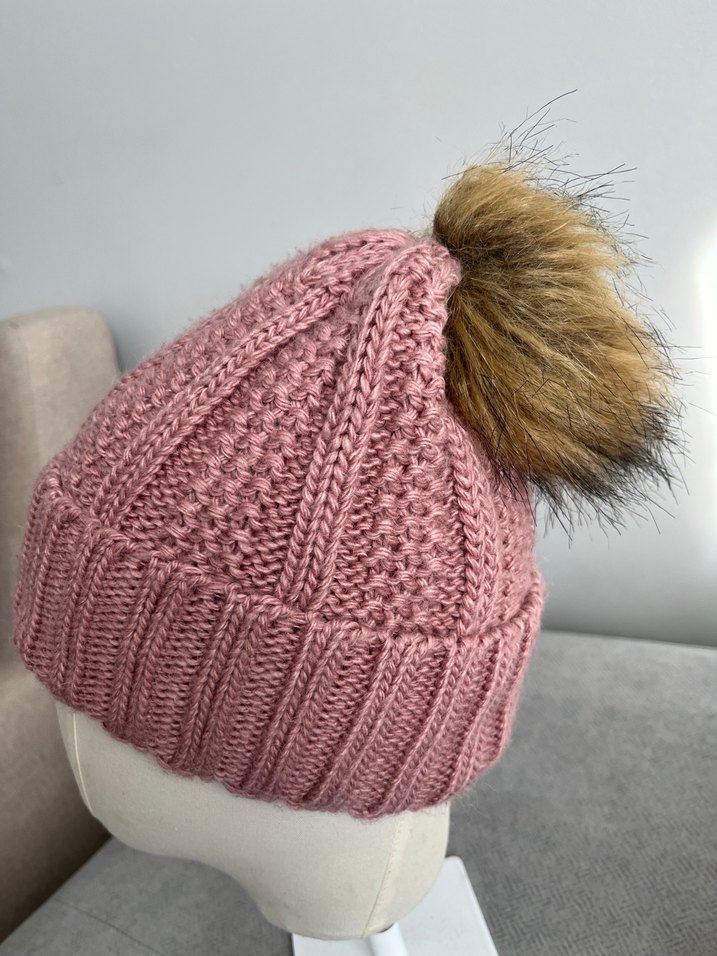 Pembe örgü kadın bere, yumuşak dokulu ve bohem tarzda, kürk ponpon detaylıdır.