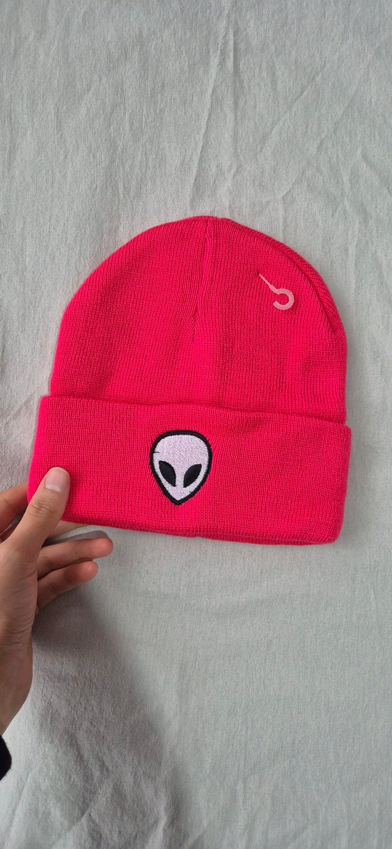Pembe örgü kadın bere, içi yumuşak ve sıcak polar astarlı, önünde alien nakışı bulunur. Trendy ve rahat bir tarz için ideal.