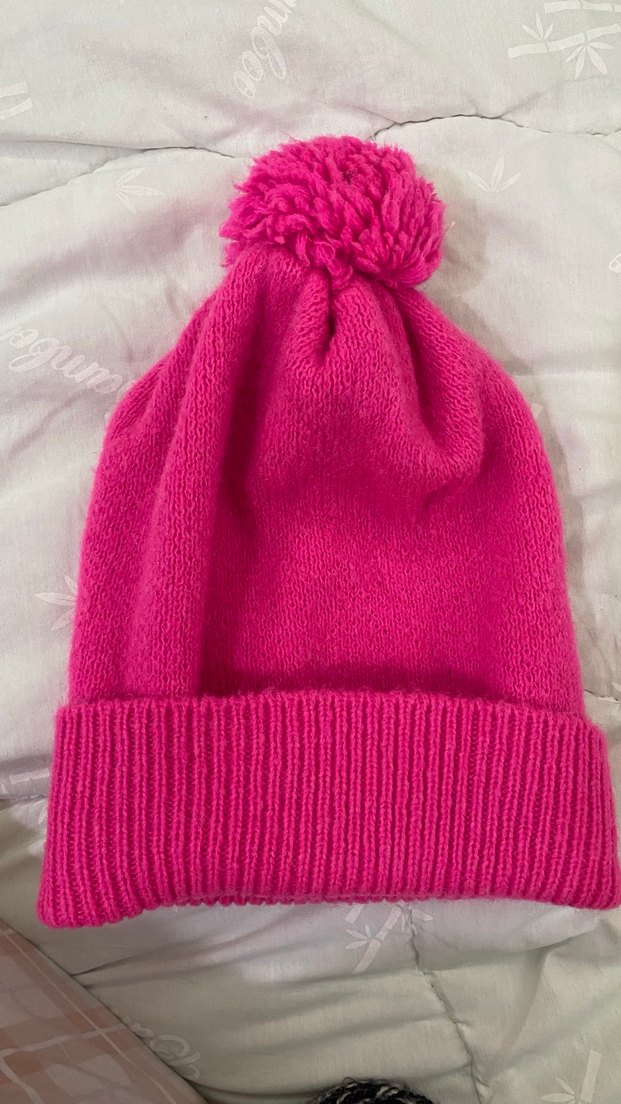 Pembe örgü kadın bere, üstte ponpon ve katlanabilir kenar ile yumuşak örgüden yapılmıştır, rahat sokak stili için uygundur.
