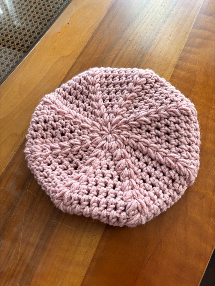 Yumuşak pastel pembede, örgü dokulu kadın bere. Rahat ve bohem tarzda, sade ve temel görünüme uygun.