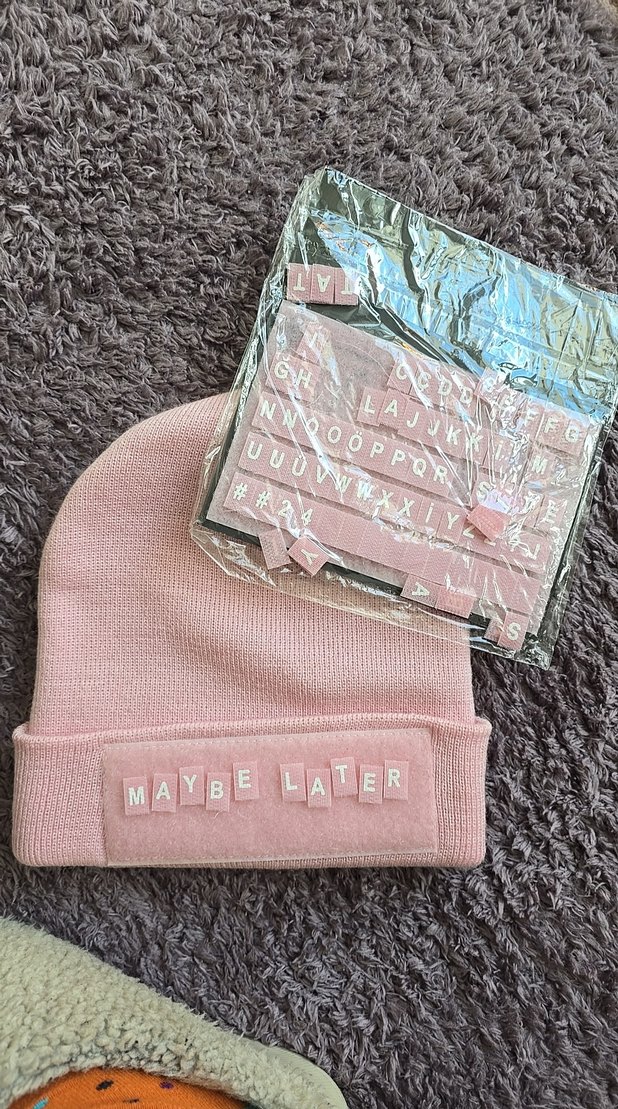 Pastel pembe örgü kadın bere, "MAYBE LATER" yazılabilir harflerle kişiselleştirilebilir. Rahat ve modaya uygun, karşı kültür tarzında bir model.