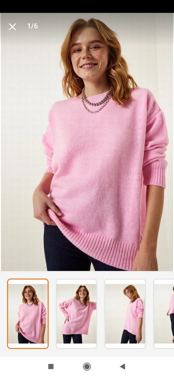 Pembe renkli, örgü dokulu, bisiklet yaka ve uzun kollu, bol kesim kadın kazak. Günlük kullanıma uygun, rahat ve sade tasarım.