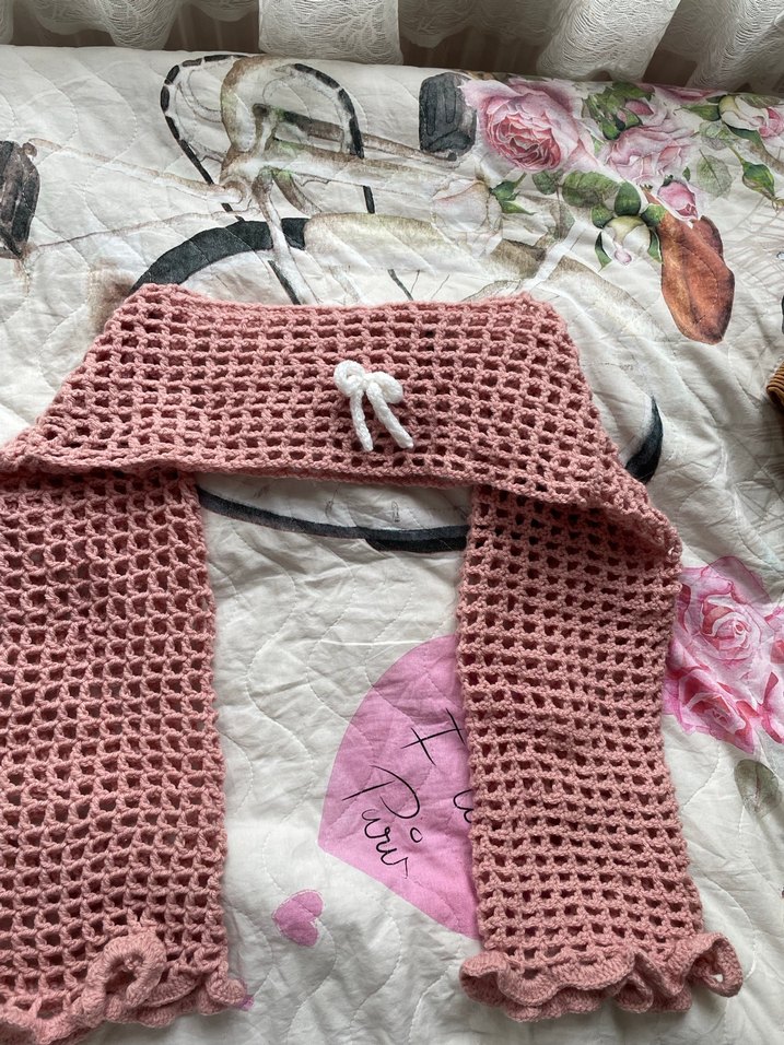 Pastel pembe renkli, açık örgü desene sahip kadın bolero . Kenarlarında ince fırfırlar ve ortasında küçük bir düğüm süsü bulunur. Sokak modasına uygundur.