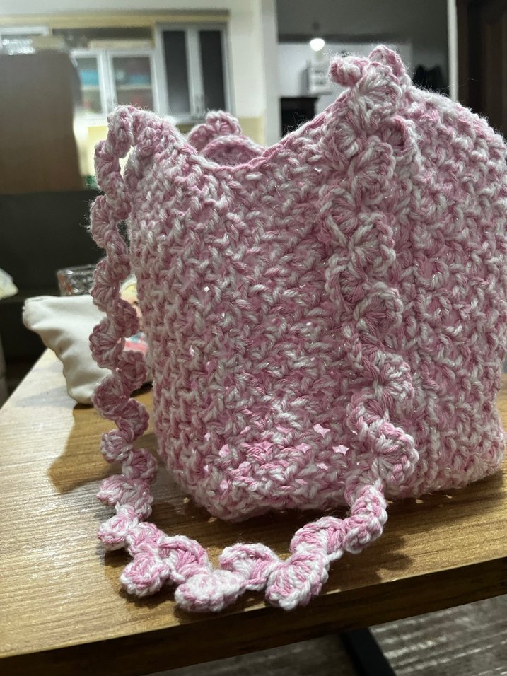 Pembe el işi örgüden yapılmış, dantel detaylı ve pastel tonlarda, bohem tarzda kadın çantası. Günlük kullanım için uygundur.
