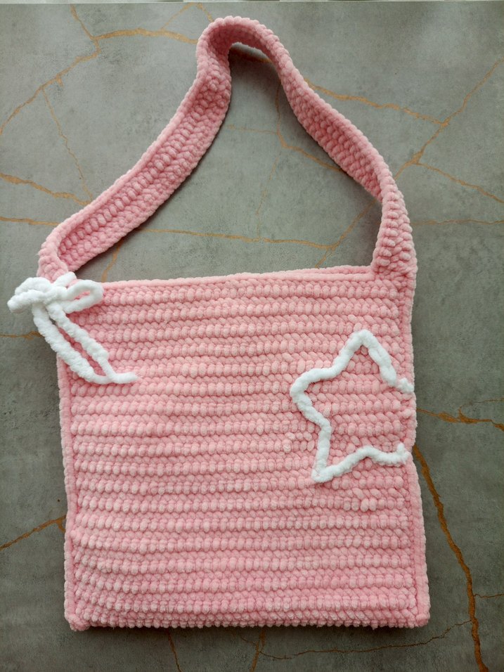 Yumuşak örgü kumaştan yapılmış, beyaz yıldız ve fiyonk detaylı, pastel pembe renkli sade örgü kadın çanta. Günlük kullanıma uygun.